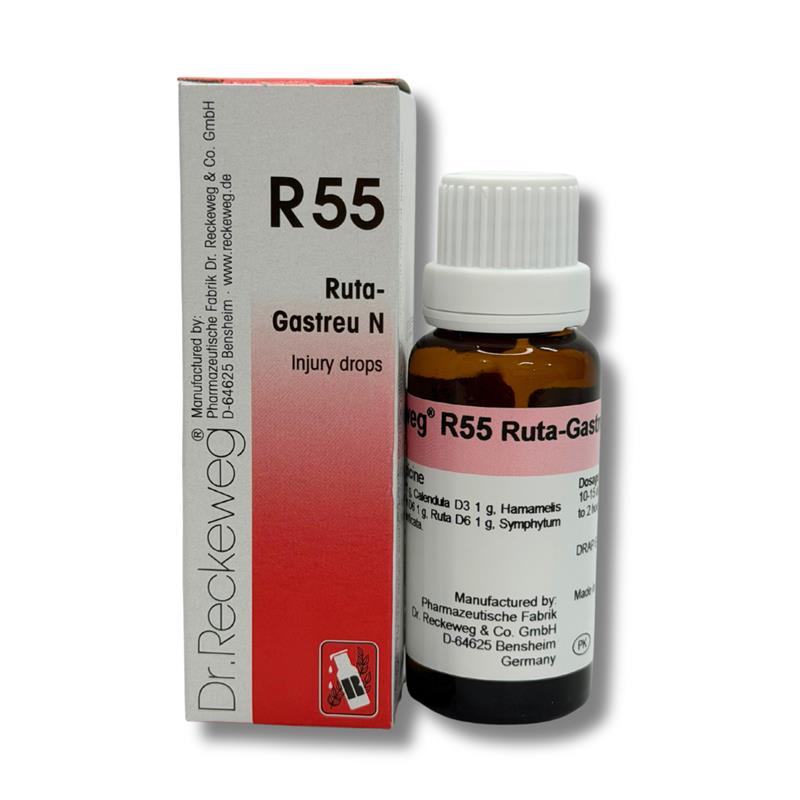 Dr. Reckeweg R-55 Ruta-Gastreu N Injury Drops is a comprehensive homeopathic formulation for trauma and injury management.